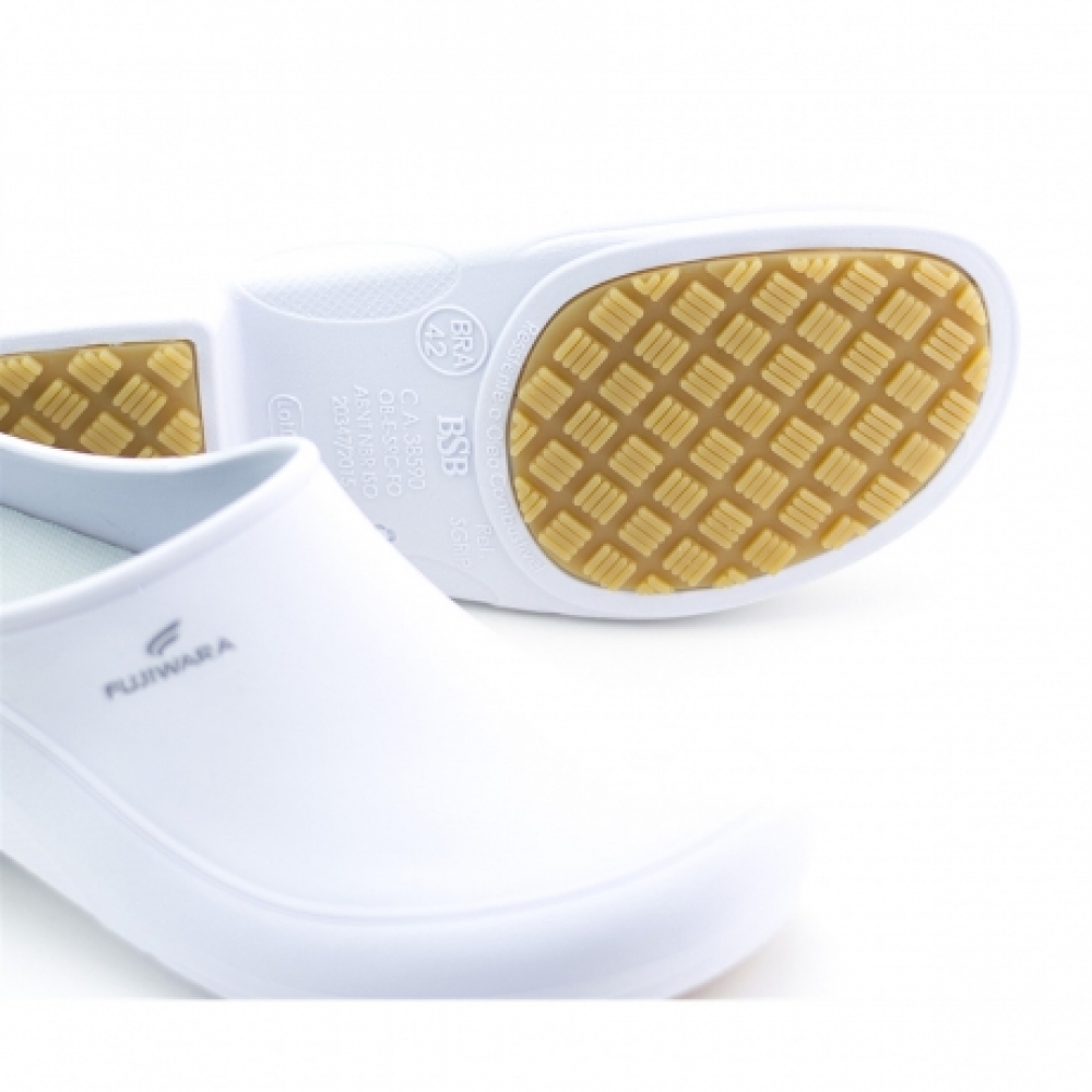 Calçado ocupacional de uso profissional, tipo sapato, impermeável, confeccionado em material polimérico, solado de borracha antiderrapante, resistente à absorção de energia e ao óleo combustível, nas cores: cabedal na cor branca e solado na cor bege; cabedal na cor preta e solado na cor bege.
